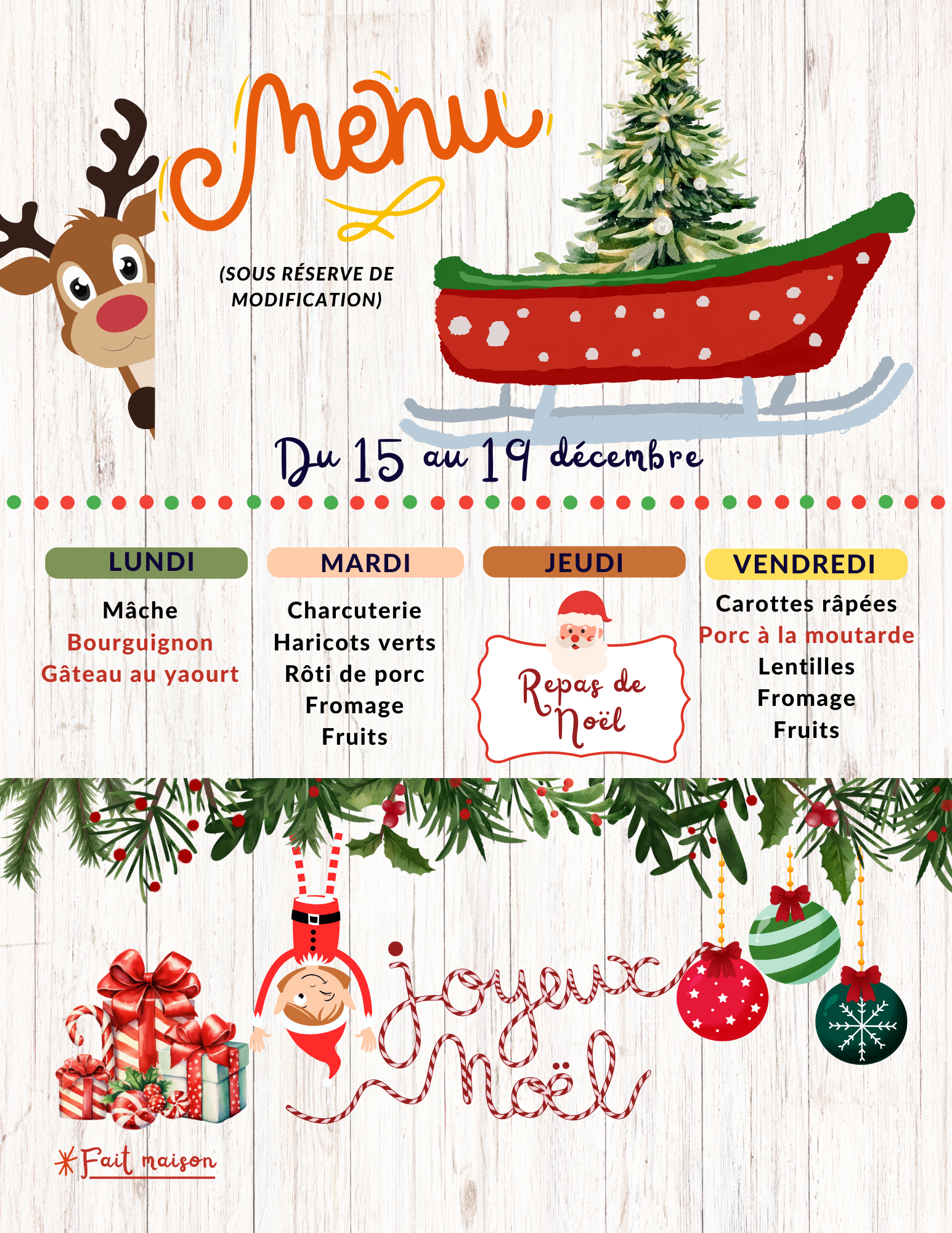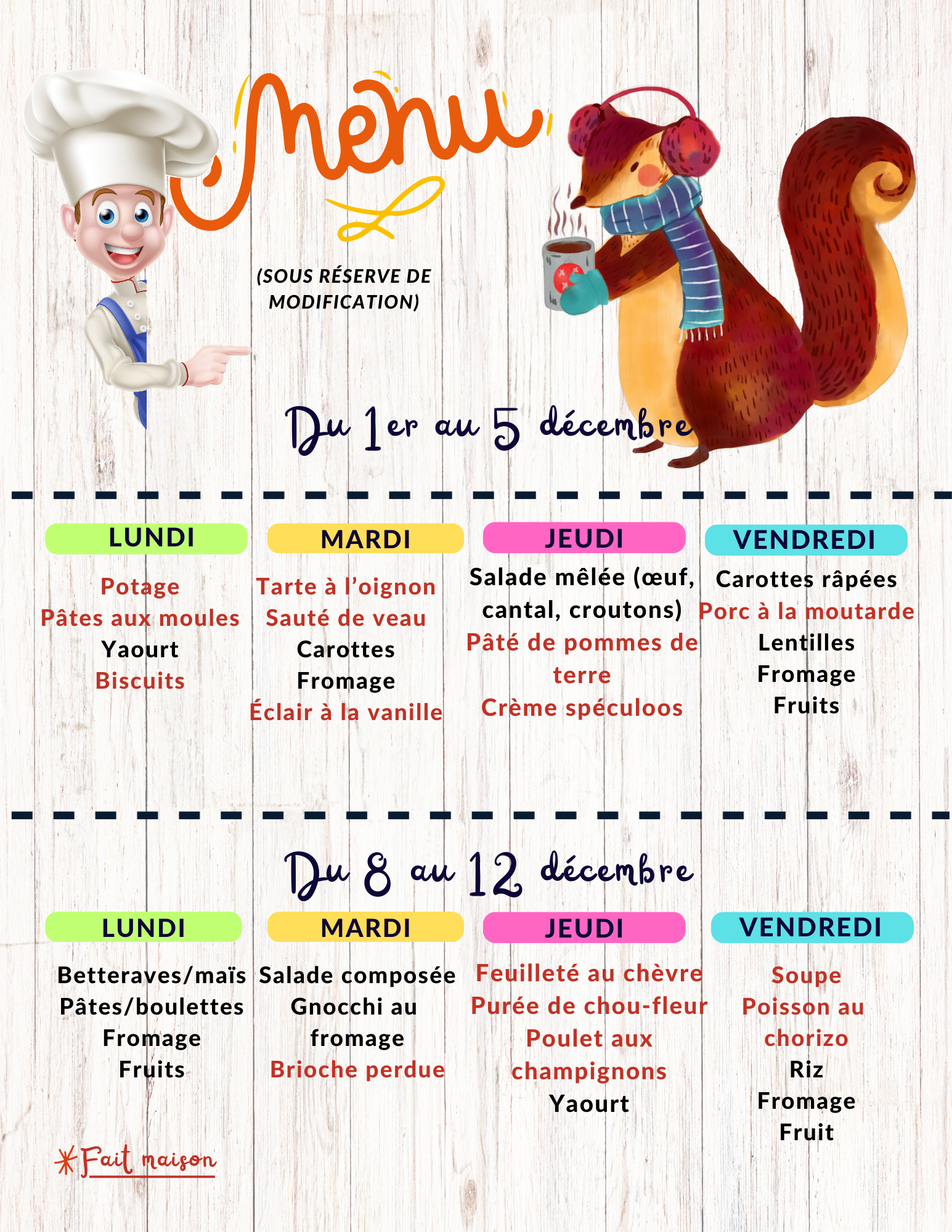 50 enfants fréquentent régulièrement le restaurant scolaire. Deux services sont assurés afin de les accueillir dans les meilleures conditions. Les repas sont confectionnés pour l’essentiel à partir de produits fournis par les commerçants locaux. Tarifs : Enfants : 3.00 € Enfant ayant un PAI avec un panier repas : 1.30 € Adulte : 6.70 € Stagiaire, service civique et AESH : 3.40 € |